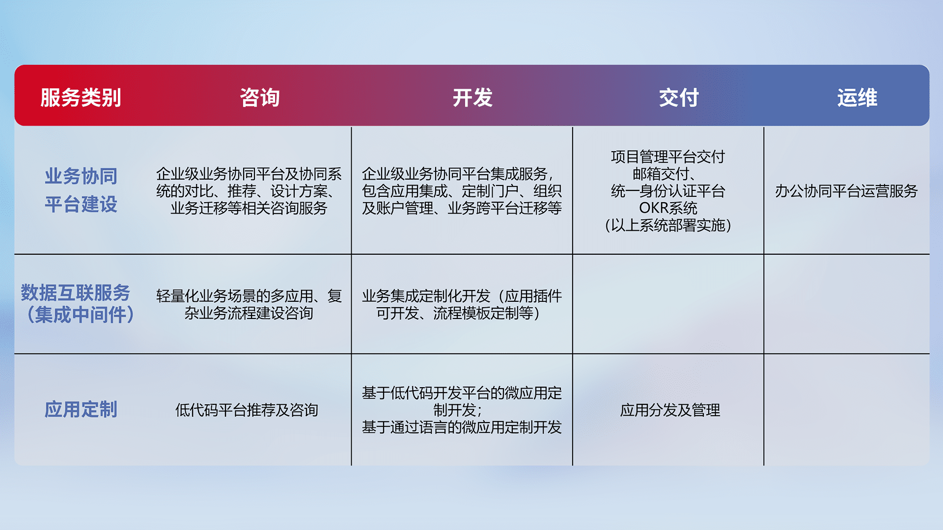 针对钉钉、、、、企微、、IDaas等平台级产品提供产品的规划、、、方案、、、、交付、、定制化开发等服务,,,实现如统一协同办公、、、智能客户服务、、、混合会议管理、、、、智能数据查询、、、等业务场景,,,,实现数字化转型。。